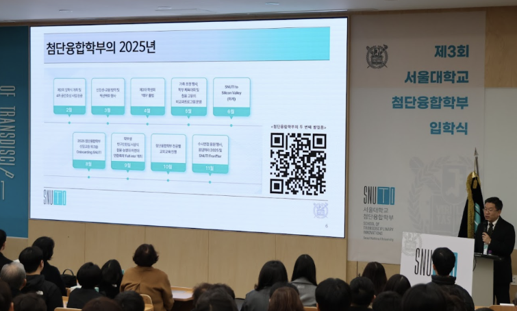제 3회 첨단융합학부 입학식 개최: 새로운 시작을 알리다   지난 2월 26일 오후 2시, 서울대학교 첨단융합학부 제3회 입학식이 개최되었다. 치열한 노력 끝에 입학한 3기 신입생들을 환영하기 위해 교수진과 선배들이 한자리에 모였다. 2024년 첫 발을 내디딘 이후 첨단융합학부는 올해도 뜨거운 열기 속에 26학번 신입생들을 맞이했다. 이준정 서울대학교 교육부총장은 축사를 통해 신입생들의 힘찬 발걸음을 응원하며 "혁신과 융합이 모인 학부에서 모두가 자유롭게 꿈꾸며 비상하길 바란다."고 전했다. 또한 이찬 최고위과정 주임교수는 환영사를 통해 신입생과 학부모에게 깊은 축하를 전하며 "여러분이 마주할 대학 생활은 단순한 전공 지식 습득 그 이상이 될 것"이라며, "예기치 못한 시행착오나 고민의 순간도 찾아오겠지만, 그 모든 경험을 마음껏 즐기길 바란다. 우리 교수님들의 연구실과 마음은 항상 여러분을 향해 열려 있다"고 강조하며 든든한 버팀목이 되어줄 것을 약속했다. 이어진 학부 소개에서는 첨단융합학부만의 독보적인 커리큘럼이 소개되었다. 방학 중 진행되는 실리콘밸리 연수 프로그램에서 현지 재직자들과의 심도 있는 토론은 곧바로 학부 연구생 활동과 프로젝트로 연결되는 선순환 구조를 갖추고 있었다. 또한 5월 가정의 달에 열리는 '패밀리 데이' 등 가족과 함께하는 프로그램은 첨단융합학부만의 따뜻한 공동체 문화를 보여주었다.   이어 첨단융합학부의 5개 전공에 대한 소개가 이루어졌다. 각 전공 교수님들이 본인 전공의 현재와 매력적인 전망을 설명하였다. △ (왼쪽부터) 혁신신약 전공, 차세대 지능형 반도체 전공 △ (왼쪽부터) 지속가능기술 전공, 융합데이터과학 전공 △ 디지털 헬스케어 전공   마지막으로 학생회와 선배들의 따뜻한 조언은 신입생들에게 큰 격려와 응원이 되었다. 경마린 학생회장(25학번)은 "신입생 여러분이 입학하기 전인 12월부터 많은 사업을 준비해 왔다"며 활기찬 학생회 활동을 예고했고, 김민건 부학생회장(25학번)은 본인의 1년을 되돌아보며 "서울대에서 만나는 뛰어난 동료들은 나를 매몰차게 채찍질하기도 하지만, 막연했던 생각을 현실적인 방향으로 이끌어주는 소중한 인사이트를 준다"고 전했다. 이어 유현재 학생(25학번)은 "무슨 과인지를 떠나 자기가 열심히 하고 잘해야 한다"는 현실적인 조언과 함께, "진로뿐만 아니라 음악 취향이나 여가 활용법 등 자신만의 캐릭터를 쌓아가는 시간을 가졌으면 좋겠다"는 따뜻한 당부를 남겼다.   △ 첨단융합학부 학생회장 경마린(왼쪽), 부학생회장 김민건(오른쪽)   △ 학생회 교육국원 유현재(첨단융합 25)   TITLE 2기 노강희 (첨단융합 25)